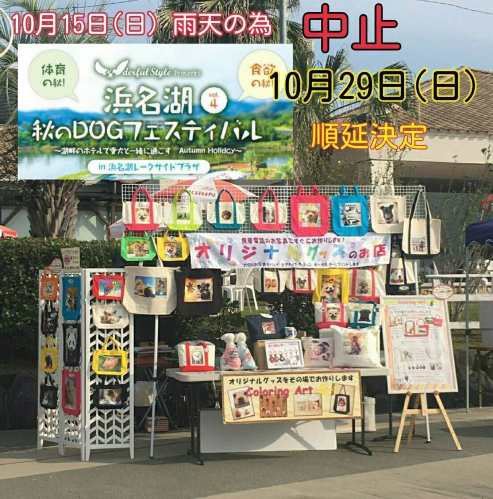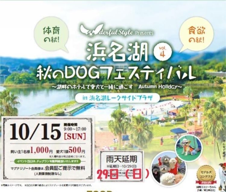 10月15日(日)は浜名湖レークサイドプラザにて、ドッグフェスティバル開催です❗お天気心配ですが、雨でしたら順延29日(日)になります。15日中止でしたら、タイムラインにてお知らせ致します。。。✨ワンちゃんと、遊びに来て下さい〰🙆 -
