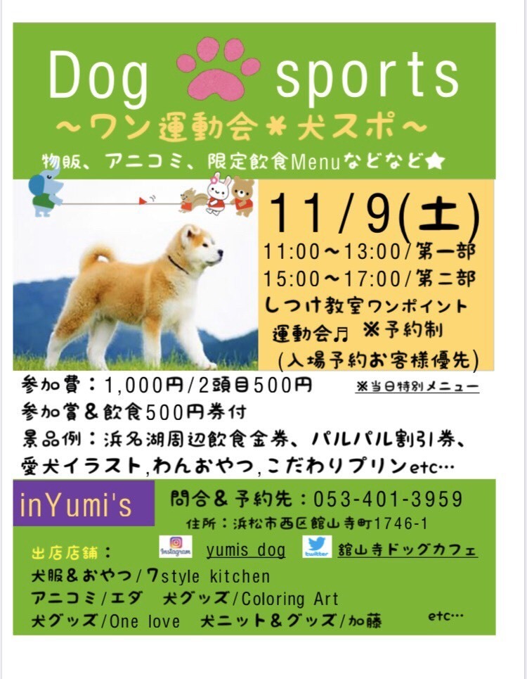 オリジナルグッズカラーリングアート11月イベント情報です。 11月9日は、ユミーズ舘山寺さんにて、Dogスポーツ。ワンちゃんの運動会の開催です。こちらは予約制になりますので、お電話にてお問い合わせお申し込み下さいませ。 0534013959ユミーズ舘山寺 1... -