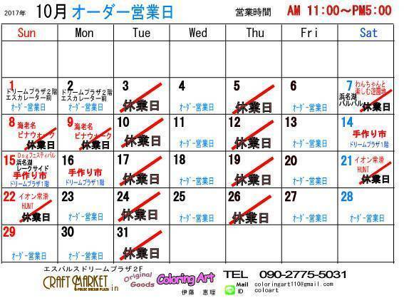 10月になりました。エスパルスドリームプラザ2階クラフトマーケット営業カレンダーです。10月は、イベント目白押し~ 7日(土)浜名湖パルパル ワンちゃんと一緒に楽しむ遊園地に出店します。 8日(日)9日(日)ビナウォーク丸井ファミリー海老名! 14日(土)... -