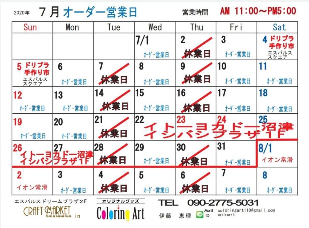 7月のエスパルスドリームプラザ2階クラフトマーケット、営業カレンダーを掲載します。赤字でイベント会場が記載の場合、当日のお渡しができません。LINEにて事前にお写真送って下さいますと、クラフトマーケットレジにてお受け取りが出来ます。是非、LINE... -